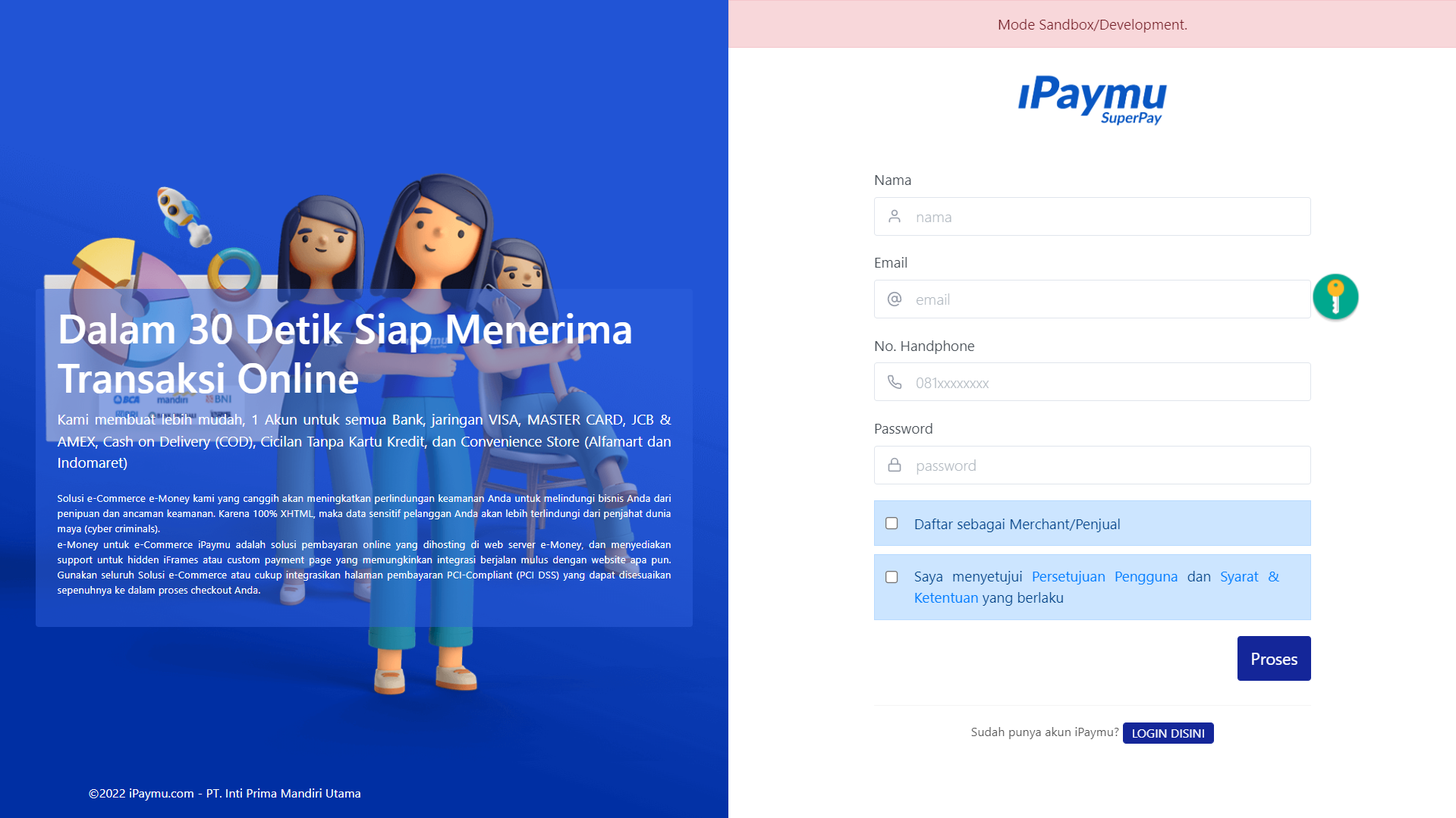 Pertama kalian daftar dulu akun Ipaymu, disini kita daftar mode sandbox aja. Mode ini sebagai mode testing untuk developer, daftar akunnya dapat dilakukan disini https://sandbox.ipaymu.com/members/register