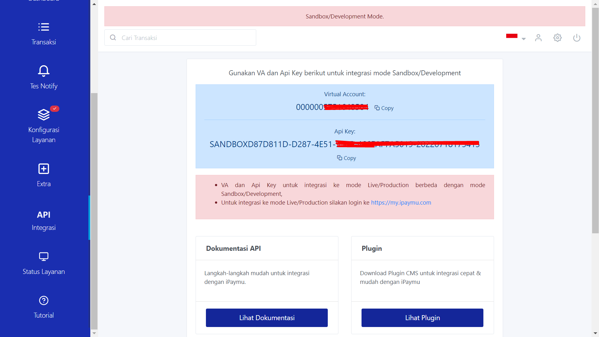 Disitu terdapat nomer virtual account dan Api Key, kedua kode unik ini akan kita gunakan nanti dalam integrasinya.