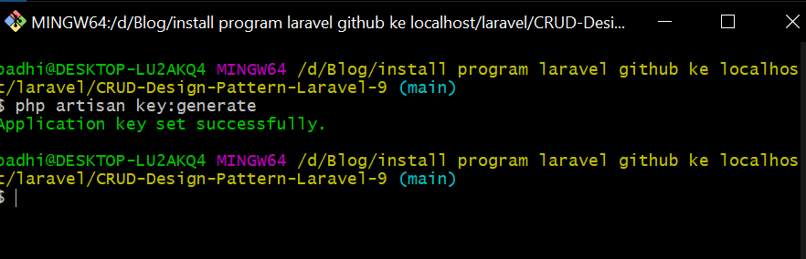 Selajanjutnya kita generate key pada program Laravel, masih dalam folder pogram silahkan ketik perintah berikut, oh iya jika file .env belum ada pada program silahkan rename .env.example menjadi .env