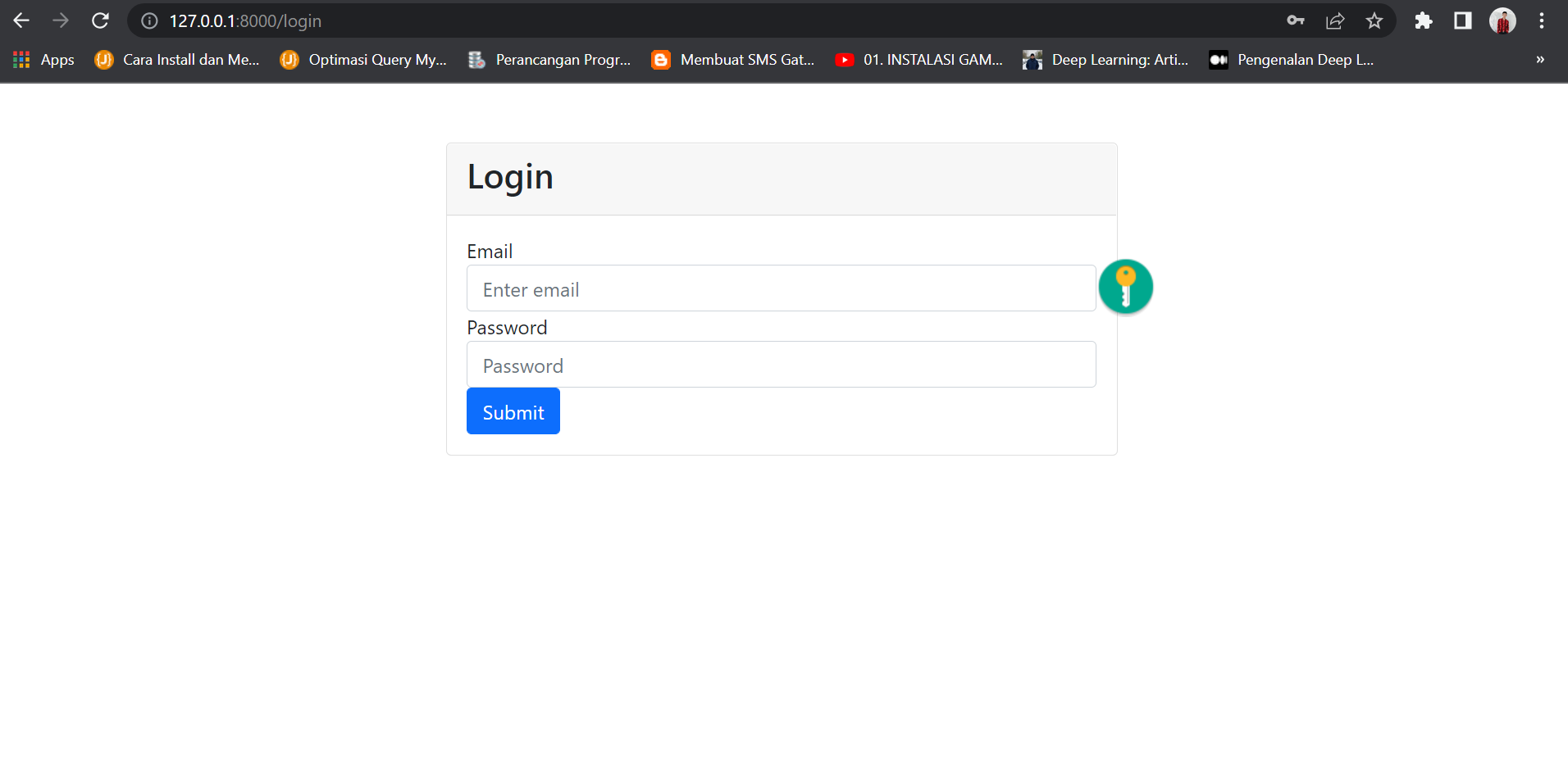 Terakhir adalah kita jalankan program Laravel, caranya dengan mengetikkan perintah, lalu buka url http://127.0.0.1:8000/