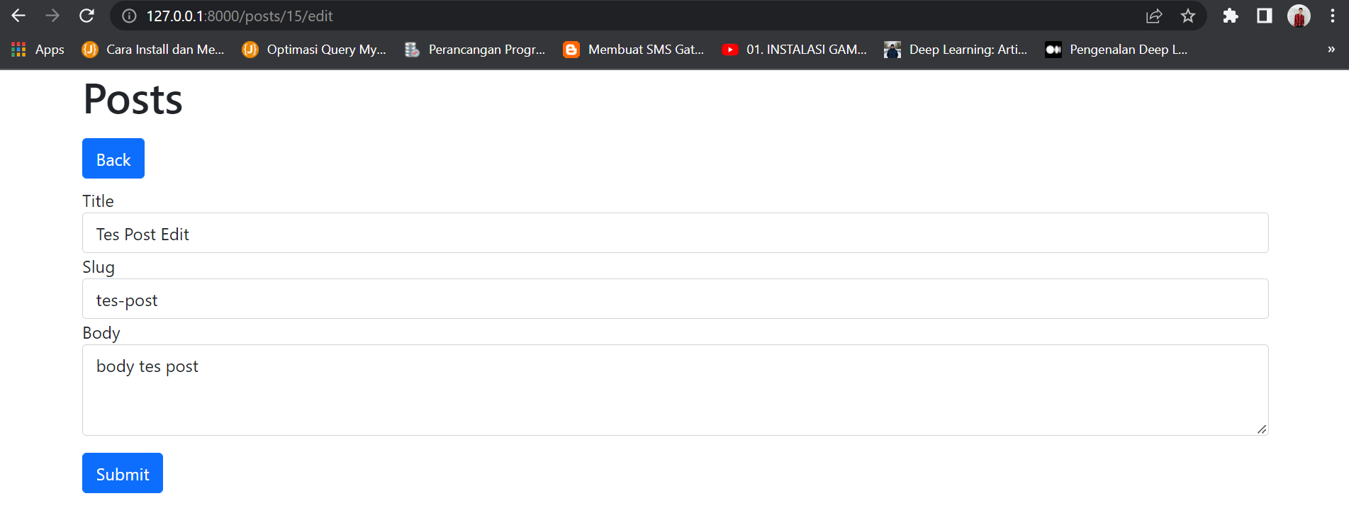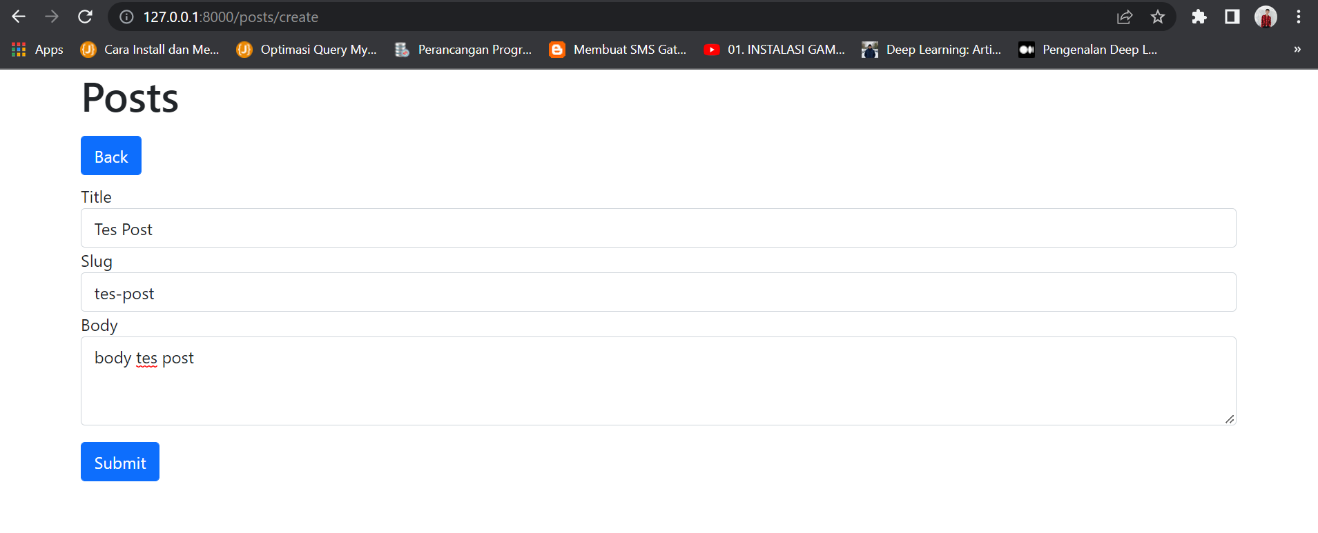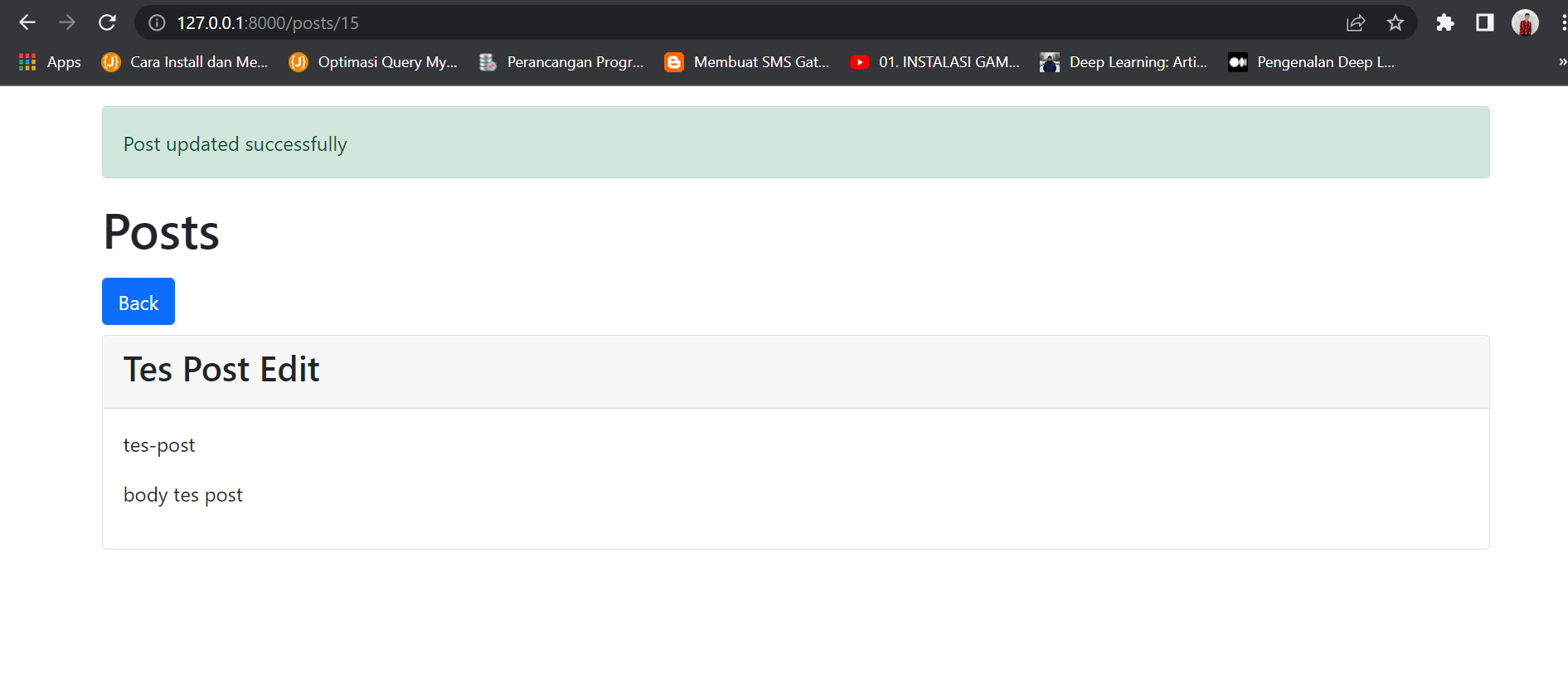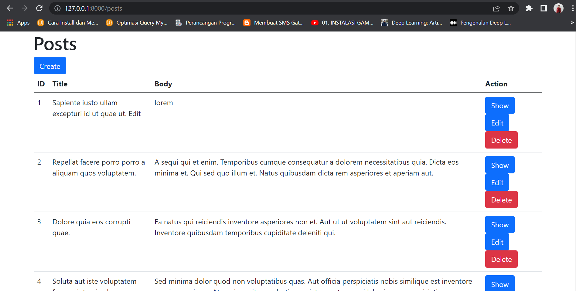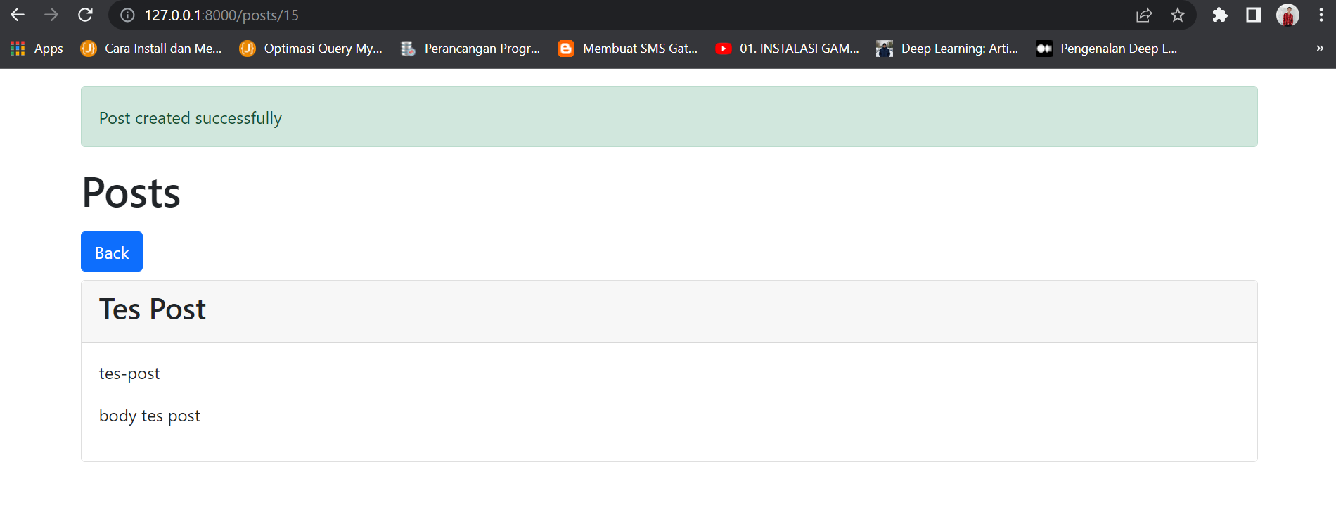 Sekarang coba kita coba running project Laravel kita, silahkan buka terminal dan ketik php artisan serve. Buka dibrowser lalu buka url http://127.0.0.1:8000/posts maka tampikan akan sebagi berikut