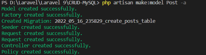 Untuk membuat Model, Controller, Migration, Factory dapat menggunakan perintah artisan Laravel caranya dengan membuka terminal/CMD pada folder project Laravel lalu ketik perintah berikut untuk membuanya sekaligus