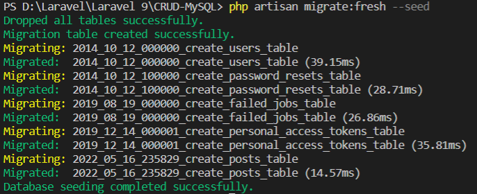 Sekarang saatnya kita melakukan migration data ke database sekaligus dengan data dummy, caranya kita menggunakan perintah artisan berikut